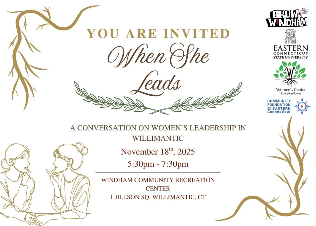 We hope you will join Grow Windham, the ECSU Women's Center, and the Town of Windham for "When She Leads", a women's leadership roundtable that focuses on sharing stories of women's power, specifically women in Willimantic. The event will be on November 18th from 5:30pm-7:30pm at the Windham Community Center. It will be a round table format where attendees will get the opportunity to hear three different stories from women of varying ages and backgrounds, all who have made impacts on the Willimantic community. There will be storytellers in both English and Spanish. |