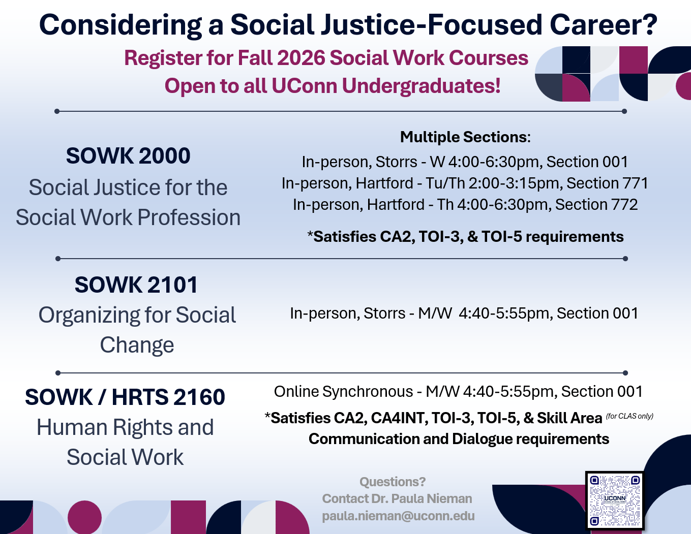 SOWK 2101. Organizing for Social Change. (3 Credits) History and theory of community organizing through a social work perspective. Basic tools and strategies that organizations and individuals use to effect change within their communities. https://catalog.uconn.edu/undergraduate/courses/sowk/